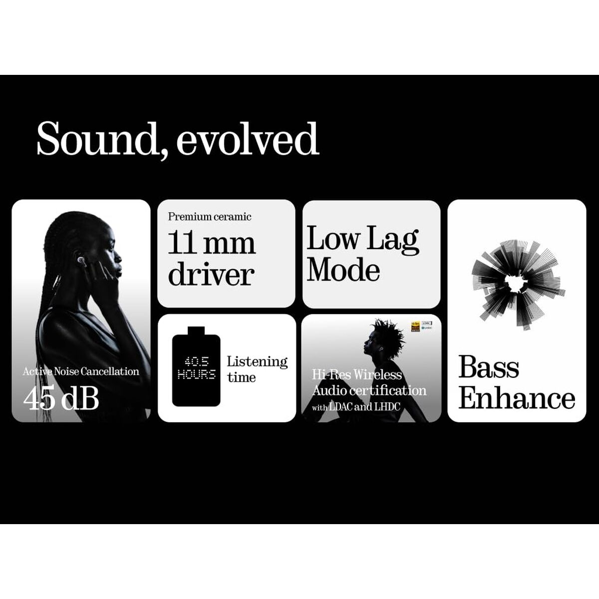 • Perfiles de Bluetooth: A2DP, AAC, AVCTP, AVDTP, AVRCP, HFP, LDAC, LHDC, SBC, SPP