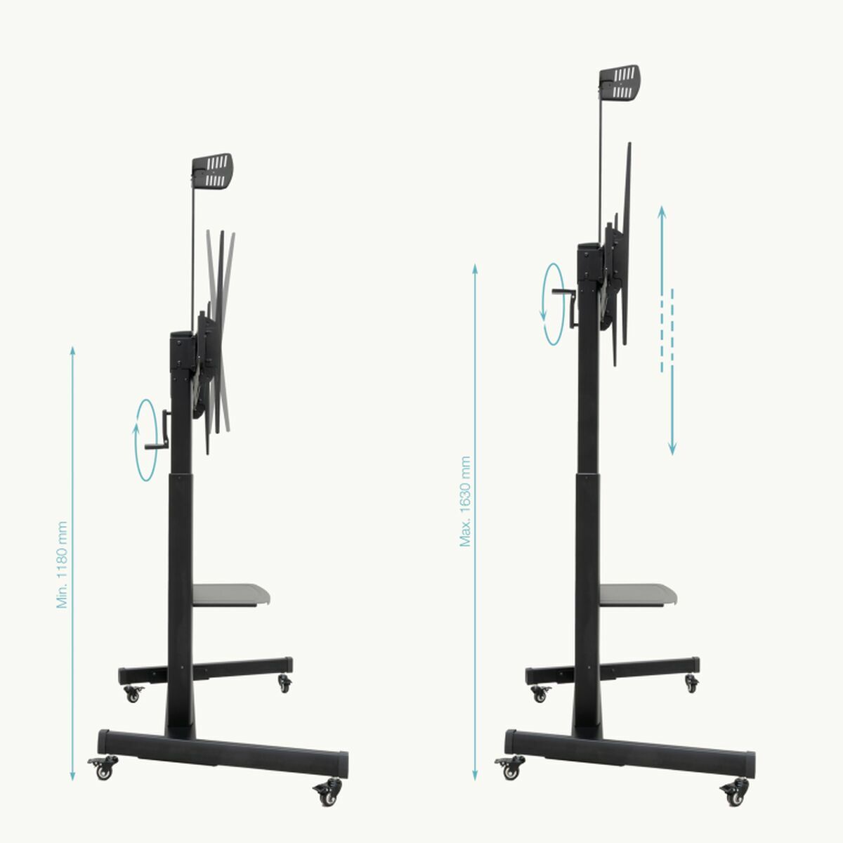 Si eres un apasionado de la informática y la electrónica, te gusta estar a la última en tecnología y no perderte detalle, compra Auriculares TooQ FS20406HM-B 60″ 100″ 130 Kg al mejor precio.El soporte para el suelo TooQ FS20406HM-B es una solución robusta y versátil diseñada para facilitar la instalación de pantallas de gran formato. Este soporte es compatible con pantallas de 60″ hasta 100″, soportando un peso máximo de 120 kg, lo que lo hace ideal tanto para monitores planos como curvos. Fabricado en acero inoxidable de alta calidad, garantiza una elevada resistencia y durabilidad, imprescindible para soportar equipos audiovisuales de peso considerable. Su diseño incluye una regulación telescópica de altura mediante manivela con un rango de ajuste entre 1180 y 1630 mm, permitiendo adaptar la posición de la pantalla a diferentes espacios y necesidades, además de un ángulo de inclinación ajustable de +5°/-10° para mejorar el ángulo de visión. Dispone de dos bandejas: una inferior de 410×340 mm para reproductores o DVD y otra superior de 285×150 mm orientada para colocar webcams u otros accesorios, ambas con un peso máximo soportado de 5 kg cada una y regulables en altura hasta un máximo total de 2303 mm con la bandeja superior. Este soporte incluye ruedas con sistema de bloqueo que facilitan su movilidad y estabilidad, con una distancia entre ruedas de 1177×740 mm, ideal para una posición segura y adaptable en entornos profesionales o domésticos. Además, tiene compatibilidad VESA desde 200×200 hasta 1000×600 mm, abarcando una amplia variedad de configuraciones y modelos de pantalla. El paquete incluye un kit completo de montaje con herramientas y manual de instalación para una puesta en marcha sencilla y segura. En conjunto, el TooQ FS20406HM-B es un soporte que combina funcionalidad, robustez y versatilidad, adecuado para quienes requieren un soporte estable y ajustable para pantallas de gran tamaño en entornos corporativos, educativos o de ocio audiovisual.