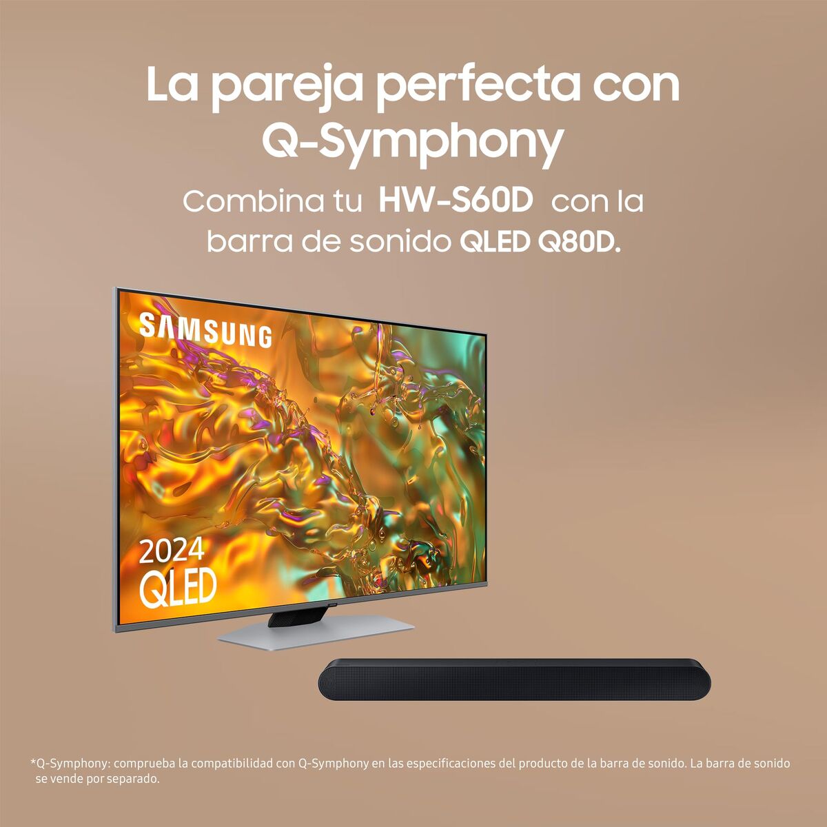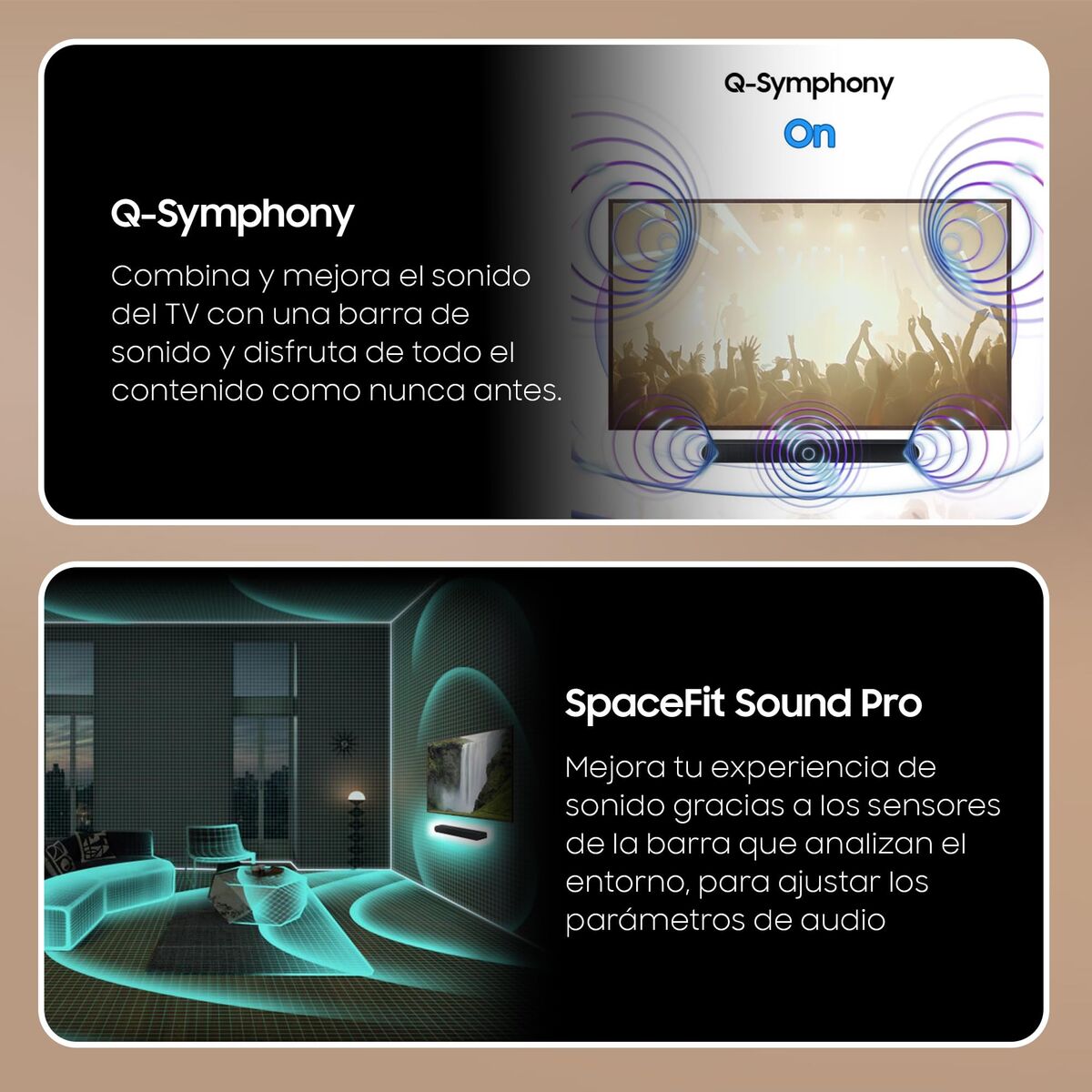 La tecnología Q-Symphony sincroniza los altavoces del televisor y los de la barra de sonido para conseguir una sinergia perfecta con un audio mejorado por inteligencia artificial que fluye a través de todos los canales.