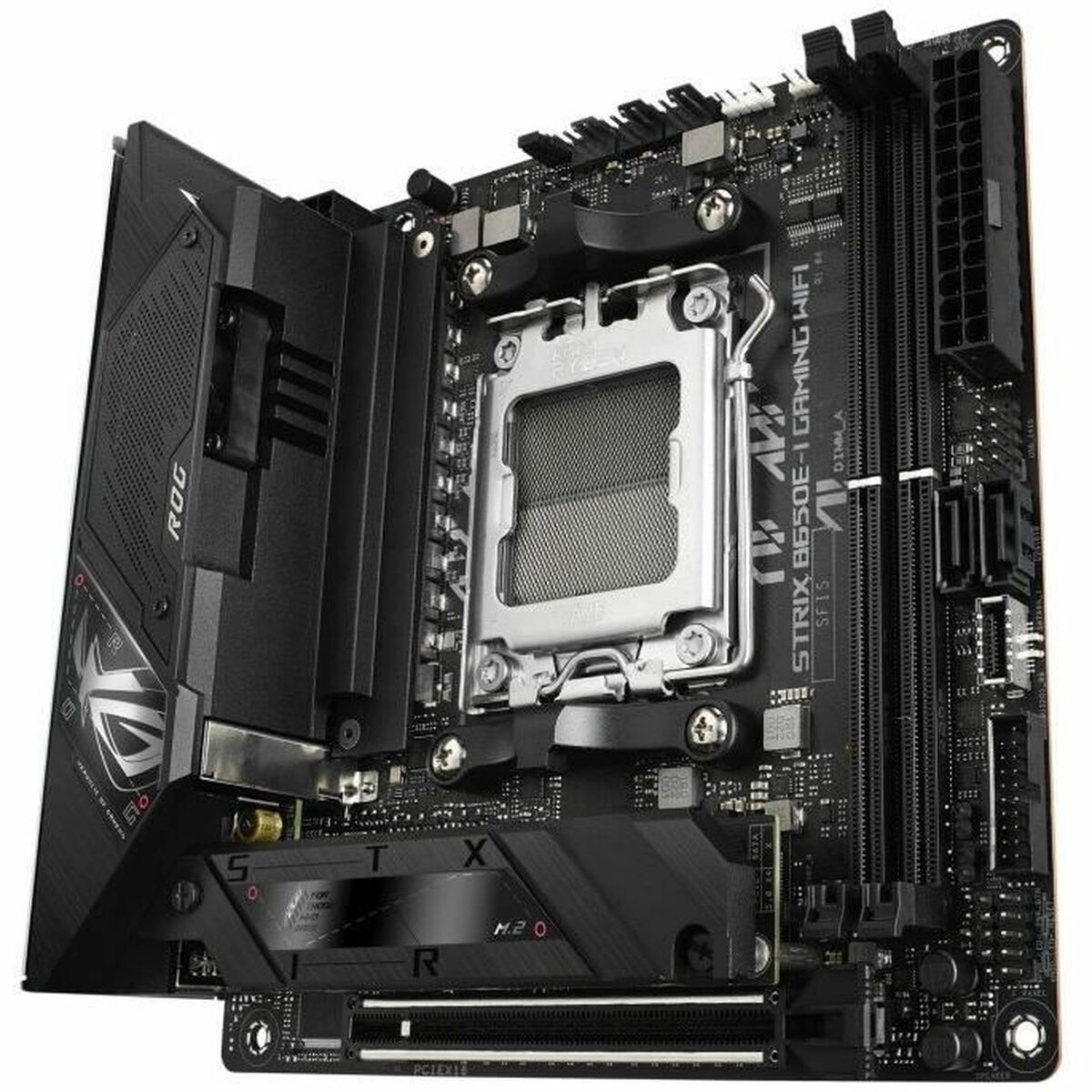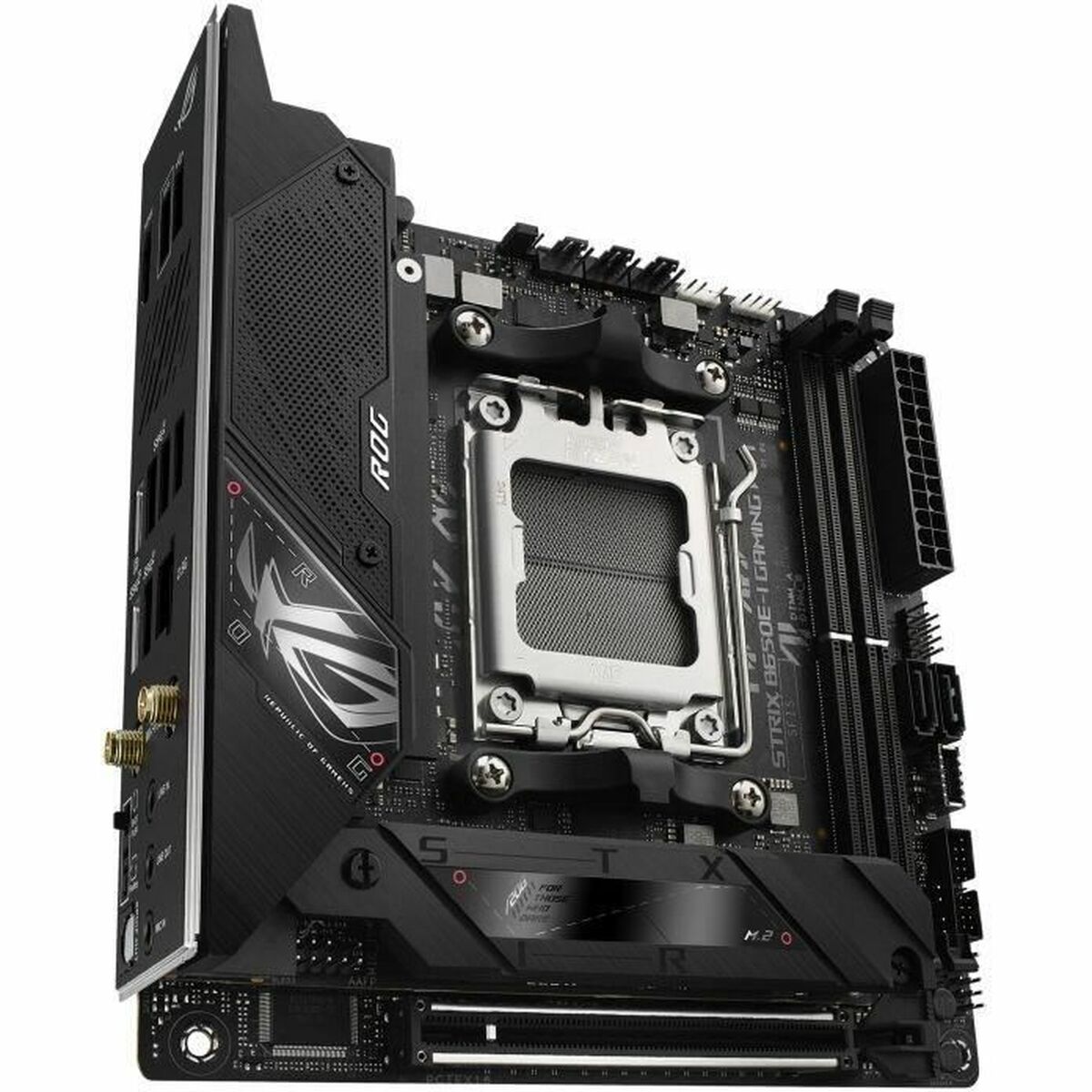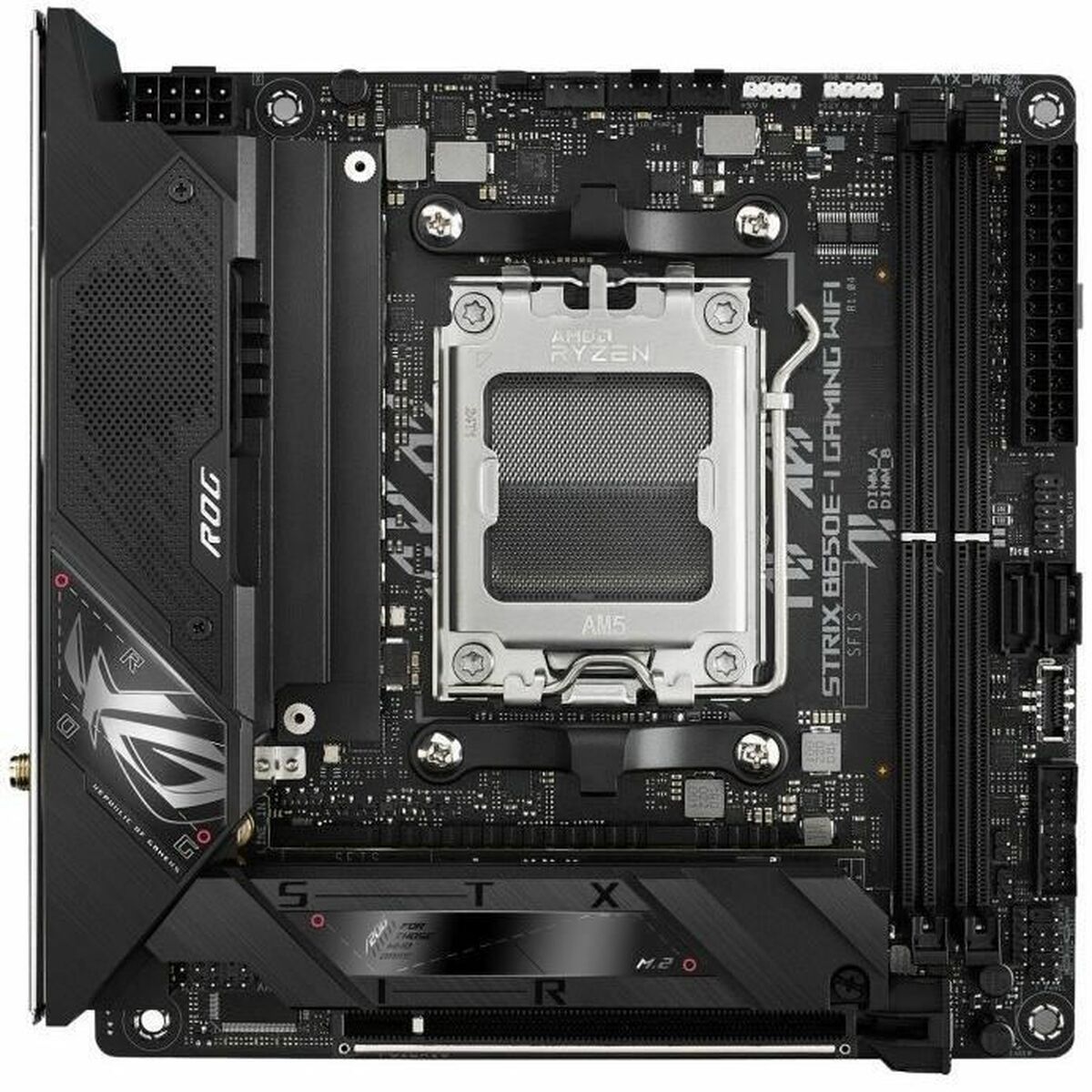 ASUS ROG STRIX B650E-I GAMING WIFI. Fabricante de procesador: AMD, Socket de procesador: Zócalo AM5, Procesador compatible: AMD Ryzen™ 7. tipos de memoria compatibles: DDR5-SDRAM, Memoria interna máxima: 64 GB, Tipo de ranuras de memoria: DIMM. Interfaces de disco de almacenamiento soportados: M.2, SATA III, Tipos de unidades de almacenamiento admitidas: HDD & SSD, Niveles RAID: 0, 1. Tipo de interfaz ethernet: 2.5 Gigabit Ethernet, Estándar Wi-Fi: Wi-Fi 6E (802.11ax), Wi-Fi estándares: 802.11a, 802.11b, 802.11g, Wi-Fi 4 (802.11n), Wi-Fi 5 (802.11ac), Wi-Fi 6 (802.11ax), Wi-Fi 6E…. Componente para: PC, Factor de forma: mini ITX, Familia del chipset: AMD