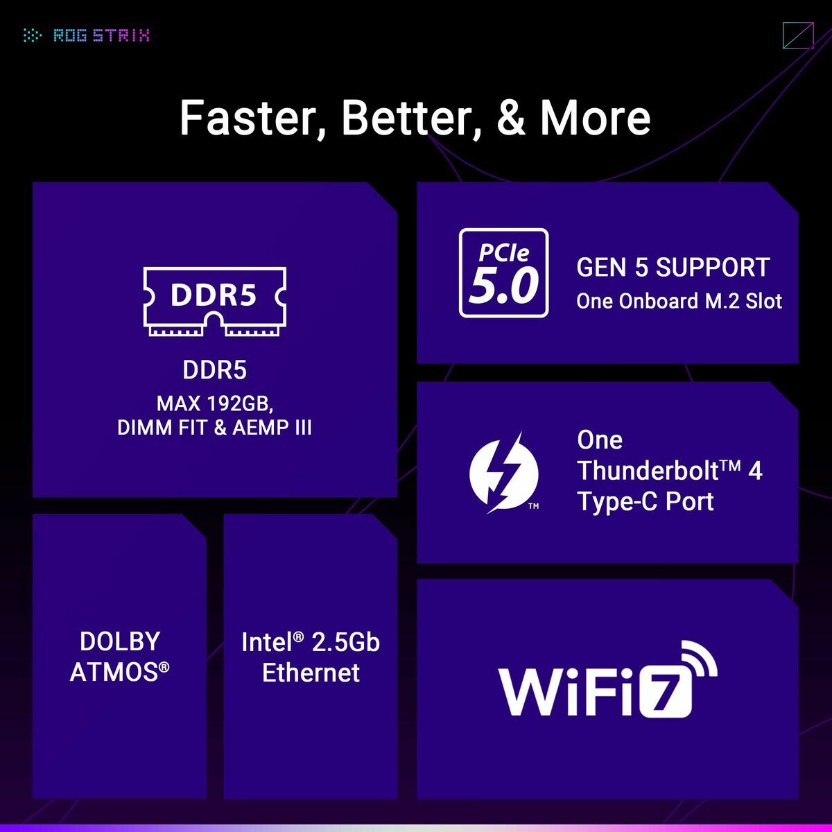 ASUS ROG STRIX B860-G GAMING WIFI. Fabricante de procesador: Intel, Socket de procesador: LGA 1851 (Socket V1), Procesador compatible: Intel Core Ultra (Series 2). tipos de memoria compatibles: DDR5-SDRAM, Memoria interna máxima: 256 GB, Tipo de ranuras de memoria: DIMM. Interfaces de disco de almacenamiento soportados: M.2, SATA III, Tipos de unidades de almacenamiento admitidas: HDD & SSD, Niveles RAID: 0, 1, 5, 10. Tipo de interfaz ethernet: 2.5 Gigabit Ethernet, Estándar Wi-Fi: Wi-Fi 7 (802.11be). Componente para: PC, Factor de forma: micro ATX, Familia del chipset: Intel