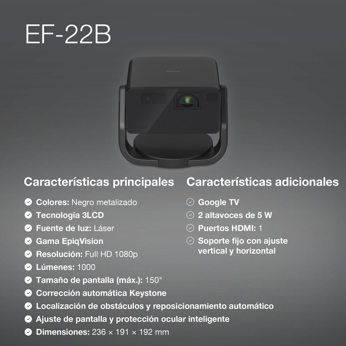 Epson EF-22B. Tecnología de proyección: 3LCD, Resolución original del proyector: 1080p (1920×1080), Razón de contraste (típica): 5000000:1. Tipo de fuente luminosa: Laser, Duración de la fuente luminosa: 20000 h. Distancia focal fija: 13,9 mm, Relación de alcance: 1.00 – 1.82:1. Modos de color de vídeo: Cine, Dinámico, Natural, Proyector, Vivo. Nivel de ruido: 22 dB, Nivel de ruido (modo económico): 18 dB