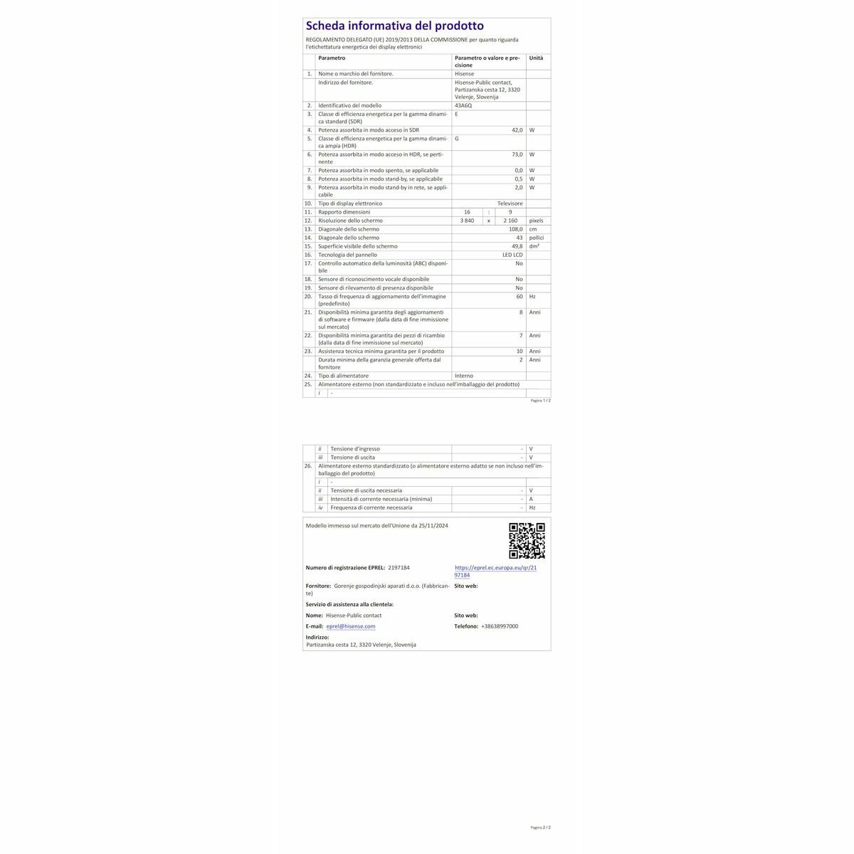¡Si buscas novedades de tendencia en el mercado, te presentamos Smart TV Hisense 43A6Q 43″ 4K Ultra HD LED HDR D-LED!El Smart TV 43″ Hisense 43A6Q es una solución versátil que ofrece una experiencia audiovisual avanzada en formato compacto, ideal para salones, habitaciones o espacios polivalentes. Cuenta con una pantalla de 43 pulgadas en elegante color negro, y proporciona imágenes de gran realismo gracias a su resolución 4K Ultra HD, donde cada detalle cobra vida con nitidez y colores vibrantes. Incorpora la plataforma Smart TV basada en VIDAA, que permite acceder de forma intuitiva a aplicaciones de streaming, navegación web, servicios bajo demanda y contenidos interactivos, ampliando considerablemente las posibilidades de entretenimiento. Integra avanzadas tecnologías de imagen como Dolby Vision, que optimiza el contraste y la profundidad tonal para una experiencia más envolvente, y Modo Juego Plus, diseñado para ofrecer baja latencia y fluidez durante sesiones de gaming, ideal para aficionados que valoran la respuesta rápida en pantalla. El sistema de sonido incluye DTS Virtual:X, proporcionando efectos envolventes y mayor presencia auditiva sin necesidad de equipos adicionales, para una sensación de cine en casa más completa. El control por voz facilita la gestión del televisor y la búsqueda de contenidos mediante comandos simples, optimizando la accesibilidad y la comodidad de uso. Su sintonizador digital multidinámico es compatible con DVB-C, DVB-S, DVB-S2, DVB-T y DVB-T2, garantizando compatibilidad con la mayoría de emisiones europeas, y dispone de funcionalidades adicionales como guía electrónica de programas (EPG), teletexto y ecualizador de audio para personalizar la experiencia a cada usuario. Con su clasificación energética E, este modelo equilibra prestaciones y consumo, posicionándose como una opción funcional y moderna para quienes buscan calidad de imagen, conectividad y facilidad de uso en el segmento de televisores inteligentes.