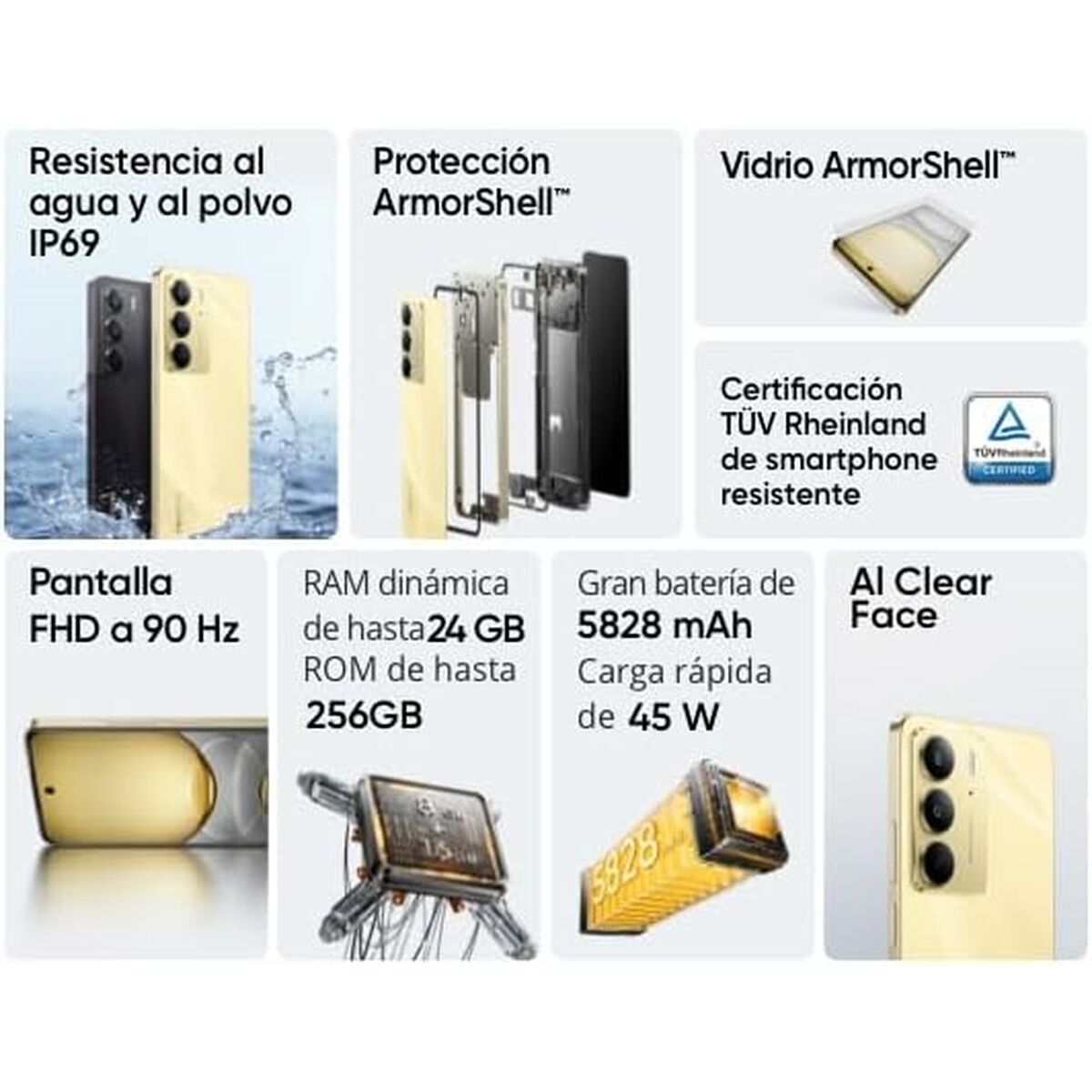 realme C75. Diagonal de la pantalla: 17,1 cm (6.72″), Resolución de la pantalla: 2400 x 1080 Pixeles. Familia de procesador: MediaTek, Modelo del procesador: Helio G92 Max. Capacidad de RAM: 8 GB, Capacidad de almacenamiento interno: 128 GB. Resolución de la cámara trasera (numérica): 50 MP, Tipo de cámara trasera: Cámara única. Capacidad de la tarjeta SIM: SIM doble. Sistema operativo instalado: Android 14. Capacidad de batería: 5828 mAh. Color del producto: Oro. Peso: 196 g