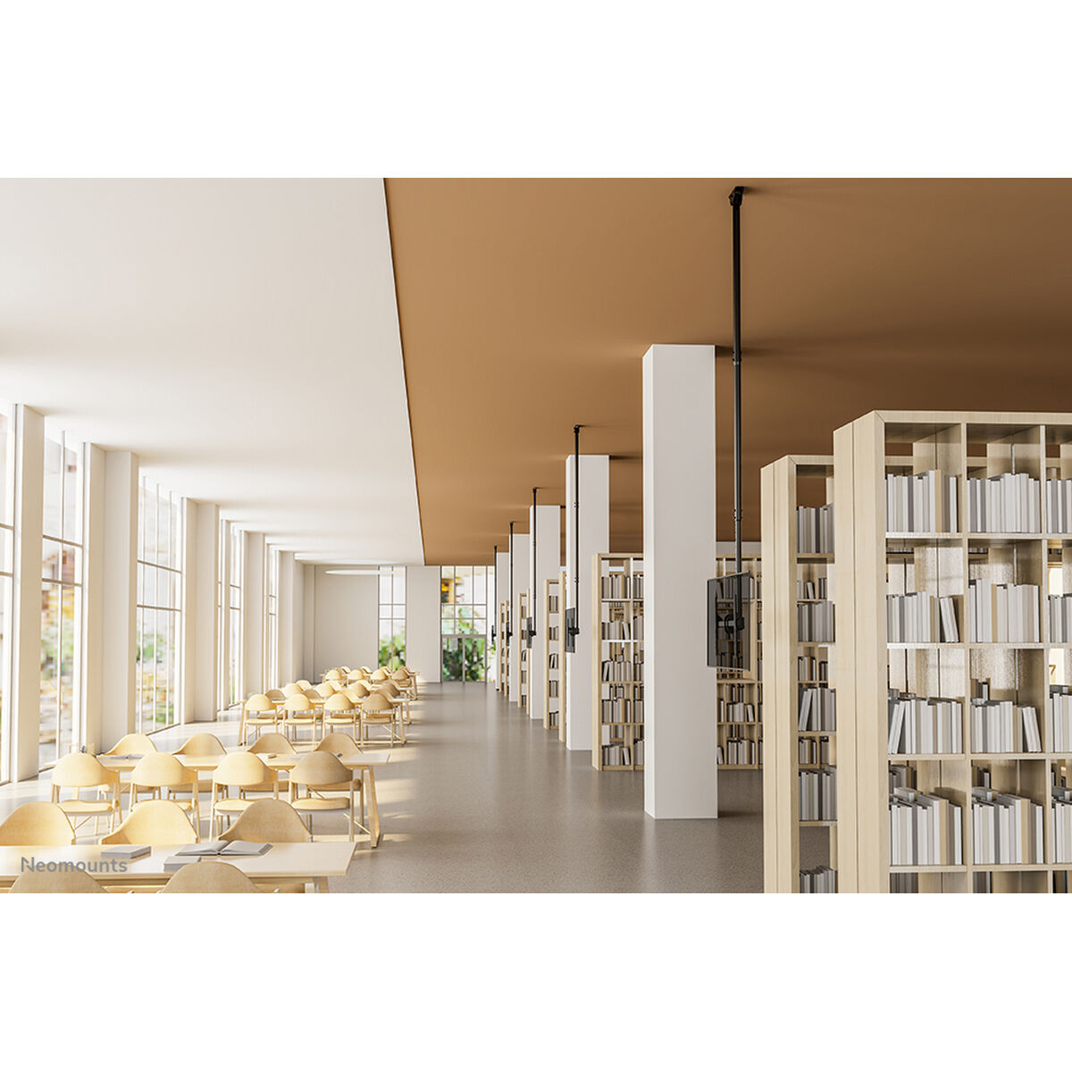 El soporte de techo tiene un mástil extra largo, que se puede ajustar fácilmente en altura de 250 a 300 cm* y tiene un peso máximo de 50 kg. El CL35-440BL16XL es adecuado para pantallas que cumplen con el patrón de agujeros VESA desde 150×200 hasta 600×400 mm. Dispone de un práctico sistema de gestión de cables, che oculta y dirige los cables desde el techo hasta la pantalla. El soporte cuenta con un ángulo de montaje ajustable para techos inclinados y viene con una cubierta adicional para la instalación en falsos techos.