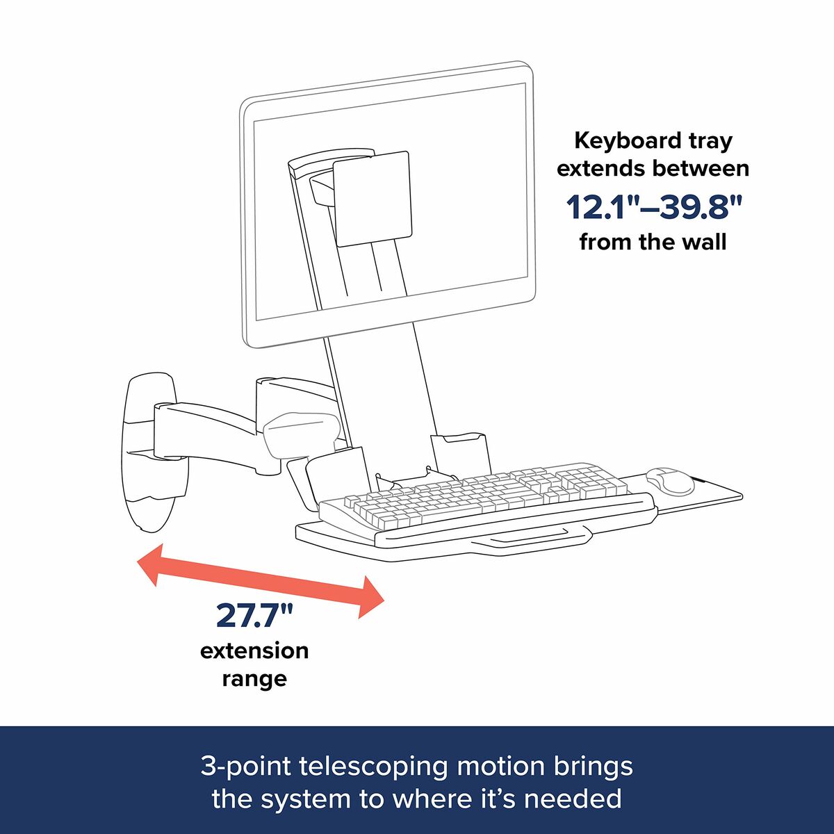 El Combo 200 tiene espacio para un monitor, lector óptico de códigos de barras, teclado, reposamuñecas y ratón en el mismo brazo. El brazo se extiende y se retrae, y se pliega por completo para quitarlo de enmedio mientras no está en uso. Un sistema exclusivo permite ocultar y organizar los cables para facilitar la limpieza.