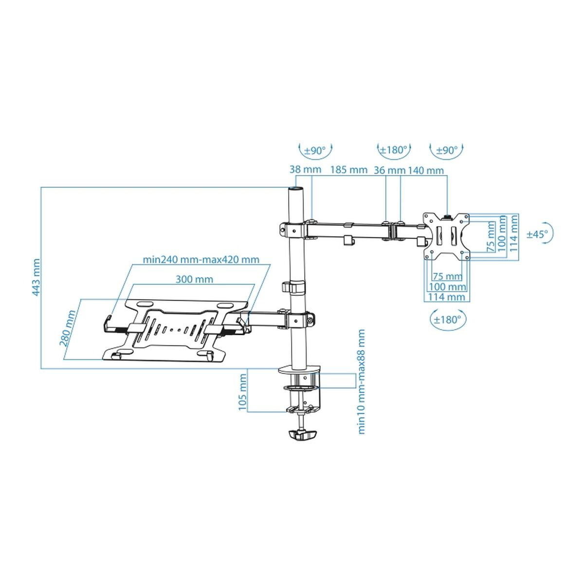 Si eres un apasionado de la informática y la electrónica, te gusta estar a la última en tecnología y no perderte detalle, compra Soporte TV TooQ 13″-32″ Negro al mejor precio.El soporte para portátil y pantalla DB1200TN-B de la marca TooQ es un soporte de sobremesa robusto y versátil diseñado para adaptar y optimizar espacios de trabajo mediante la sujeción segura de equipos. Fabricado en acero resistente y acabado en color negro, este soporte es compatible con pantallas y portátiles, abarcando un rango de tamaño de 13 hasta 32 pulgadas para monitores y de 10 a 15,6 pulgadas para ordenadores portátiles. Soporta un peso máximo de 8 kg por brazo en pantalla y hasta 4,5 kg en portátil, asegurando una fijación estable y fiable. Destaca por su completa compatibilidad con los estándares VESA 75×75 y 100×100, lo que facilita la instalación de la mayoría de monitores del mercado. Su diseño funcional permite ajustes ergonómicos con un amplio rango de movimientos: inclinación de +45°/-45°, giro de +90°/-90° y rotación completa de +180°/-180°, posibilitando la orientación óptima de la pantalla o portátil según las necesidades del usuario. El soporte se fija al escritorio mediante abrazadera o tornillo pasante, apto para superficies con un grosor comprendido entre 10 y 88 mm en abrazadera y 10 a 75 mm con tornillo, lo que brinda gran adaptabilidad en diferentes tipos de muebles. Su bastidor tiene una altura de 443 mm y el conjunto pesa aproximadamente 6,32 kg netos, ofreciendo estabilidad sin ser excesivamente pesado. El producto se entrega completo, incluyendo un kit de montaje con herramienta y manual de instalación, facilitando el ensamblado sin complicaciones. Este soporte está pensado para optimizar el espacio de trabajo y mejorar la ergonomía al permitir la correcta posicionamiento de pantallas y portátiles dentro de un rango amplio de medidas, lo que lo hace adecuado para entornos profesionales y domésticos. En definitiva, el TooQ DB1200TN-B es una solución práctica y resistente para quien necesita una sujeción adaptable, segura y eficiente para sus dispositivos de visualización y trabajo.