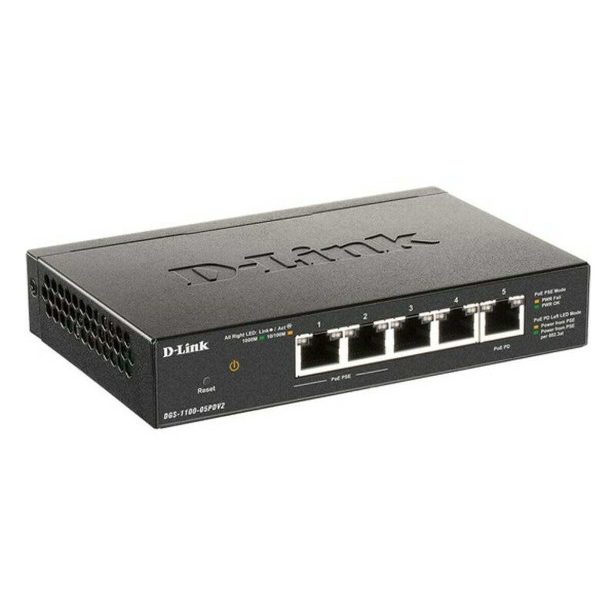 D-Link DGS-1100-05PDV2. Tipo de interruptor: Gestionado. Puertos tipo básico de conmutación RJ-45 Ethernet: Gigabit Ethernet (10/100/1000), Cantidad de puertos básicos de conmutación RJ-45 Ethernet: 5. Bidireccional completo (Full duplex). Tabla de direcciones MAC: 2000 entradas, Capacidad de conmutación: 10 Gbit/s. Energía sobre Ethernet (PoE)